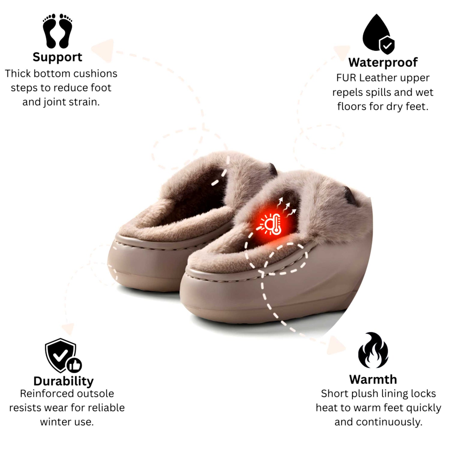 Thoughtfully designed with plush fur, warm fleece lining, and a supportive closed heel for elevated everyday comfort.